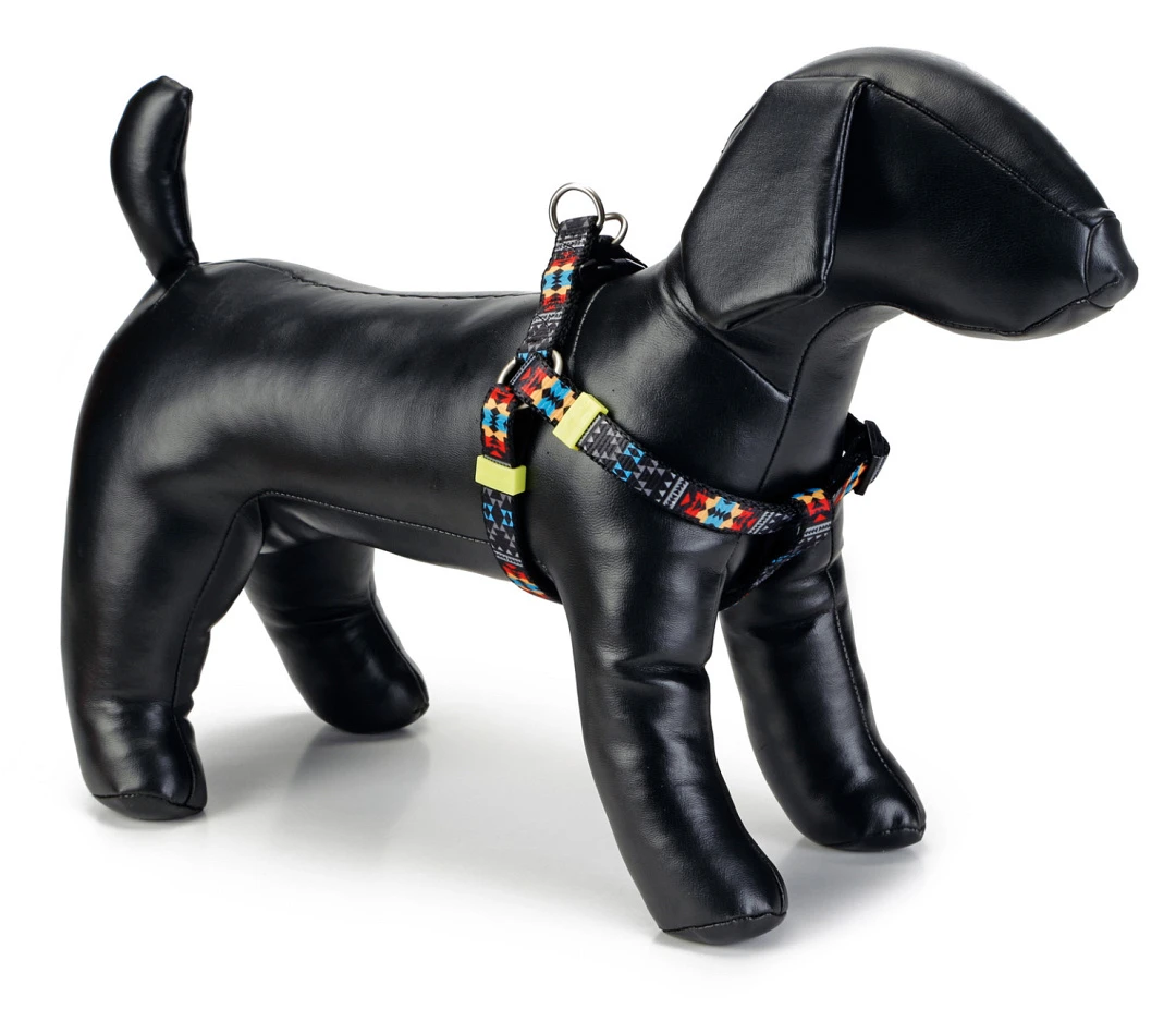 Kleurrijk borsttuig van nylon met leuke details. Verstelbaar en met handige kliksluiting.