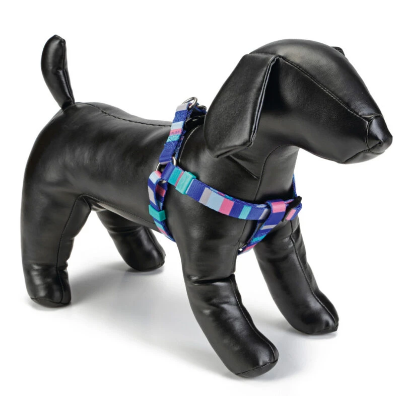 Kleurrijk borsttuig van nylon met leuke details. Verstelbaar en met handige kliksluiting.