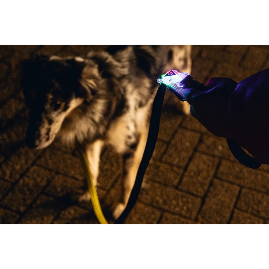 Deze hondenriem is ook geschikt voor de donkere dagen! Dit omdat de hondenlijn reflecterend is en er in de waterproof kliksluiting ledverlichting verwerkt zit. De verlichting werkt op batterij en is in te stellen op 3 verschillende standen: langzaam knipperen, knipperen en snel knipperen. Rood, groen en blauw licht zit in de verlichting verwerkt.