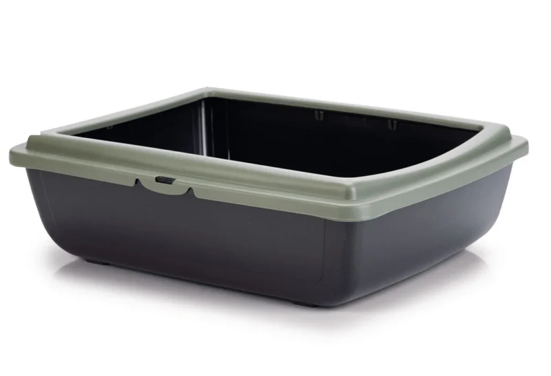 Kattenbak van gerecycled plastic met een lage instap. Gemakkelijk schoon te maken door de afneembare rand. Afm. 48 x 38 x 14 cm.