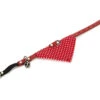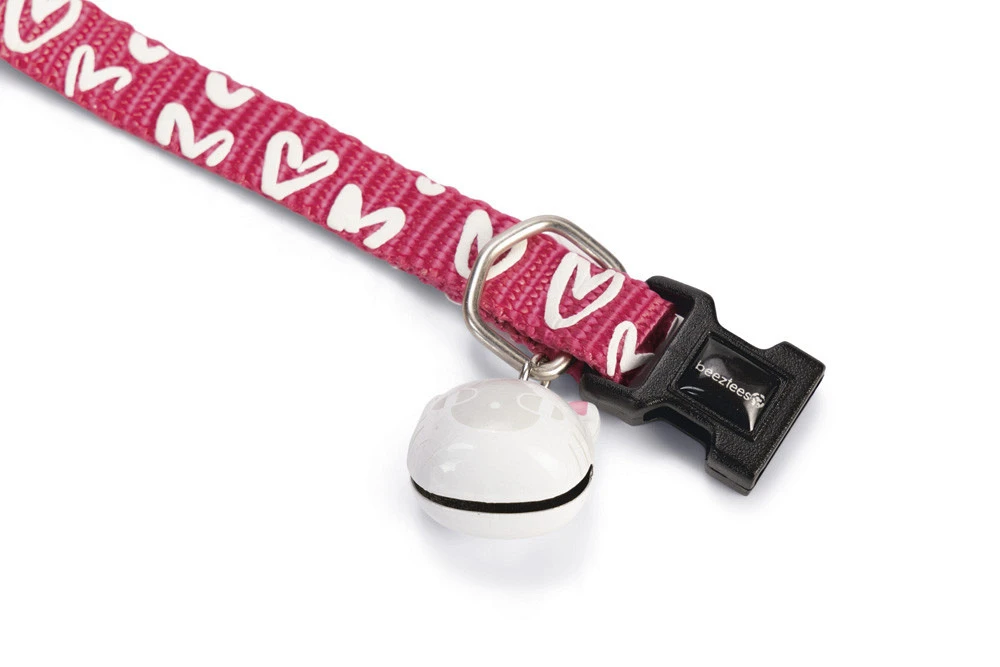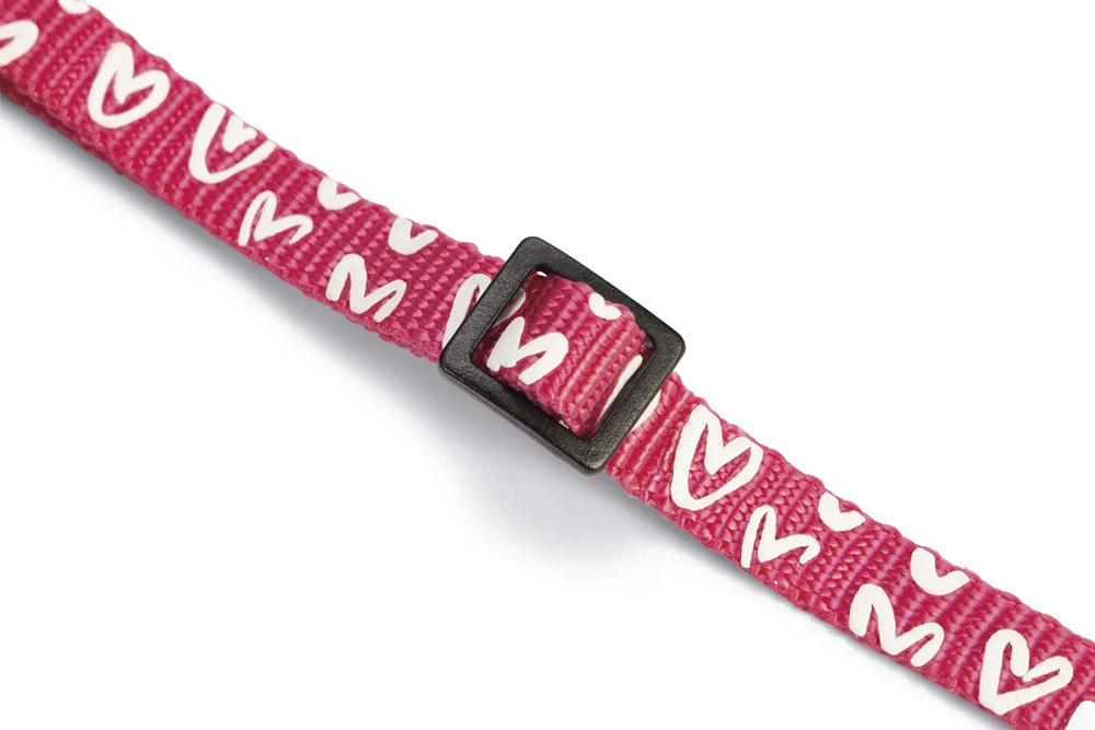 Nylon kattenhalsband met vrolijk hartjesmotief, kattenbelletje, veiligheidssluiting en D-ring om looplijn aan te bevestigen. Verstelbaar van 20 tot 30 cm.