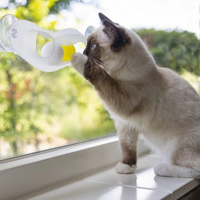Actiespeelgoed voor kittens. Met zuignappen voor bevestiging op het raam.