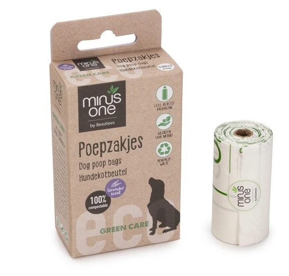 De Beeztees Minus One Poepzakjes Lavendel zijn ideaal om mee te nemen tijdens het wandelen met jouw hond. Deze poepzakjes zijn sterk en lekvrij. De zakjes zijn gemaakt van composteerbaar, afbreekbaar én milieuvriendelijk materiaal. Zo is er gebruik gemaakt van PLA (composteerbaar polyester), PBAT (wordt gebruikt voor bio-plastic producten vanwege zijn flexibiliteit) en zetmeel (wordt gebruikt in bioplastic als een soort lijm.). Deze poepzakjes hebben een lavendelgeur.