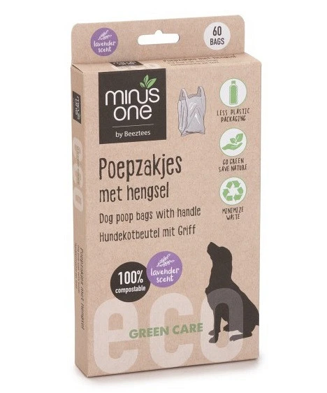 De Beeztees Minus One Poepzakjes met Handvat Lavendel zijn ideaal om mee te nemen tijdens het wandelen met jouw hond. Deze poepzakjes zijn gemakkelijk dicht te knopen, sterk en lekvrij. De zakjes zijn gemaakt van composteerbaar, afbreekbaar én milieuvriendelijk materiaal. Zo is er gebruik gemaakt van PLA (composteerbaar polyester), PBAT (wordt gebruikt voor bio-plastic producten vanwege zijn flexibiliteit) en zetmeel (wordt gebruikt in bioplastic als een soort lijm.). Deze poepzakjes hebben een lavendelgeur.