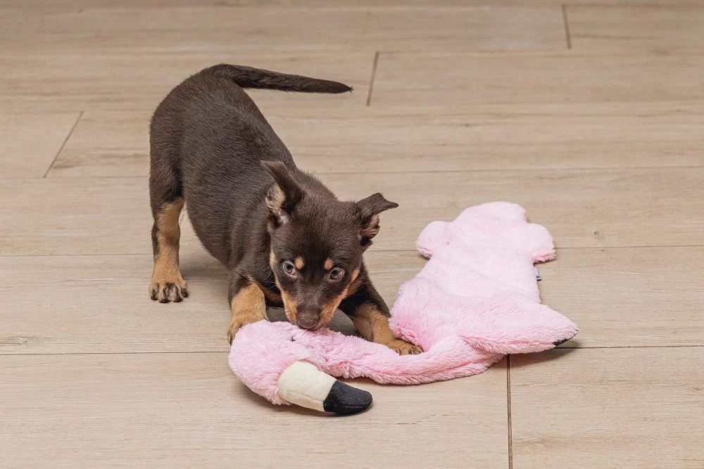 De Flatino heeft een zachte gevulde kop, maar geen vulling in het lijfje. Daarnaast is er geen piep in de hondenknuffel verwerkt, waardoor de knuffel geen geluid maakt als ermee gespeeld wordt. Zo kan jouw pup uren en vooral rustig, knuffelen en spelen met zijn of haar Flatino Flamingo Fe