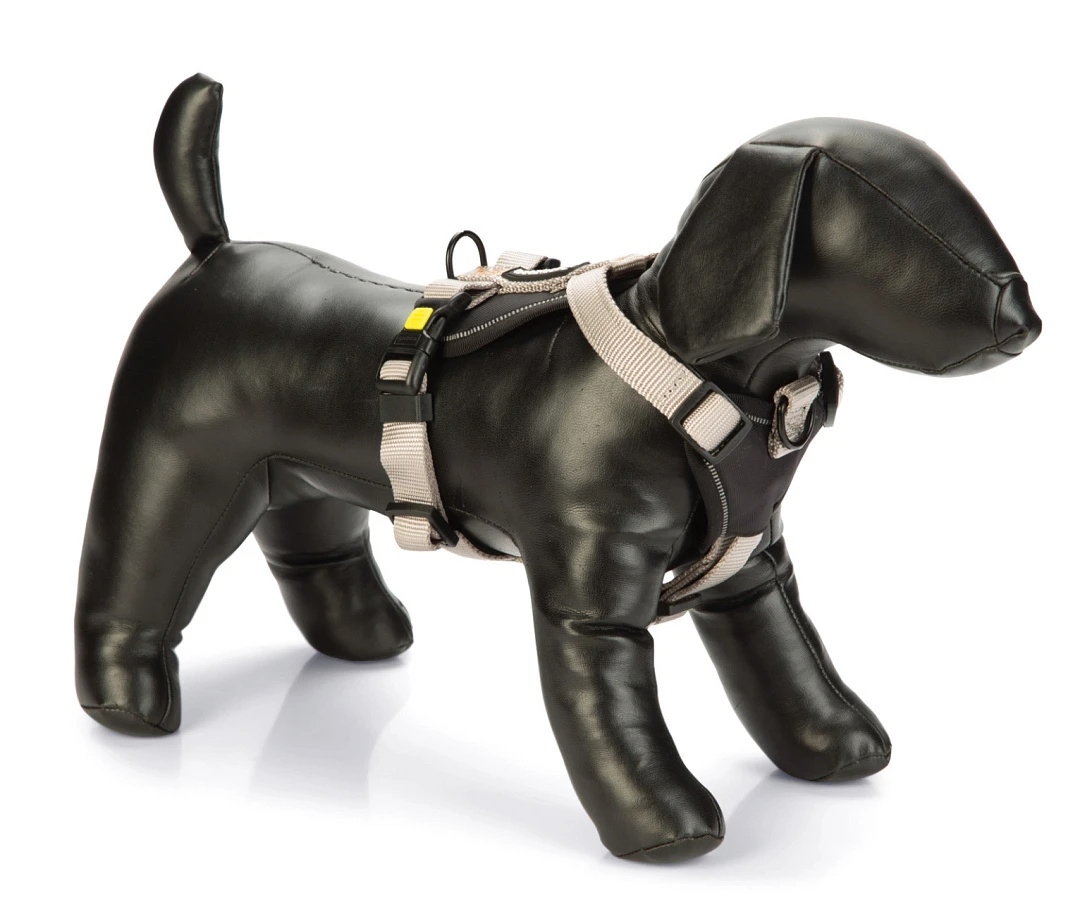 Luxe, volledig verstelbaar, nylon Y-tuig met neopreen voering. Om trekken tegen te gaan kan de riem ook aan de voorkant van het tuig bevestigd worden.
